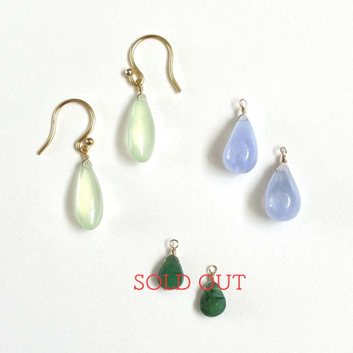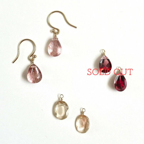 k10の柔らかな色合いと質感が美しいフックと3種類の天然石チャームがセットになったピアスです。