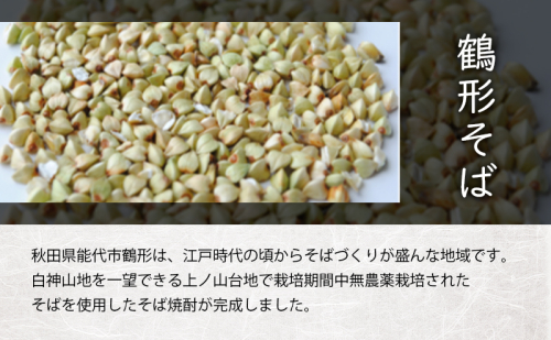 まろやかで豊かな香りと深い味わいの逸品です。 江戸時代の頃からそばづくりが盛んだった能代市鶴形から、伝統ある「鶴形そば」と「能代市産あきたこまち」を使ったそば焼酎をお届けします。