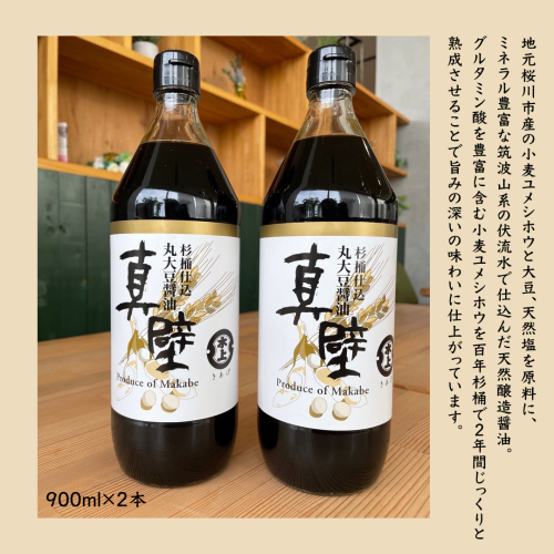 地元桜川市産の小麦ユメシホウと大豆、天然塩を原料に、ミネラル豊富な筑波山系の伏流水で仕込んだ天然醸造醤油。グルタミン酸を豊富に含む小麦ユメシホウを百年杉桶で2年間じっくりと熟成させることで旨みの深いの味わいに仕上がっています。