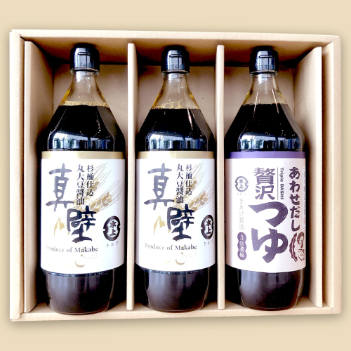 - 丸大豆醤油 ・真壁 ( 900ml × 2本 ) と 贅沢つゆ ( 900ml × 1本 ) の 詰め合わせ きあげ 醤油 木桶仕込み しょうゆ しょう油 つゆ 天つゆ めんつゆ 調味料 国産 丸大豆 小麦 食塩 砂糖 みりん かつおぶし しいたけ 椎茸 昆布 こんぶ 老舗 鈴木醸造 桜川市 [EP006sa]