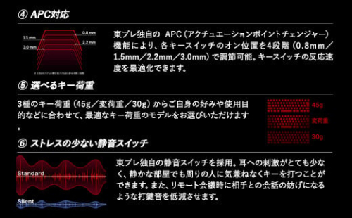 長時間のタイピングでも指が疲れにくい静電容量無接点スイッチを採用し、押し心地が滑らかで耐久性に優れています。