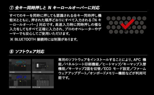 長時間のタイピングでも指が疲れにくい静電容量無接点スイッチを採用し、押し心地が滑らかで耐久性に優れています。