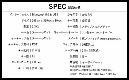 IT企業、金融機関、医療機関、教育機関など様々な産業で使用されているプロ用のキーボード。 長時間のタイピングでも指が疲れにくい静電容量無接点スイッチを採用し、押し心地が滑らかで耐久性に優れています。 【メーカー】 東プレ株式会社 【型番】 R3HC22 【サイズ】 163mm×379mm×30mm 【カラー】 スーパーホワイト 【スペック】 キー印刷:昇華印刷 キー荷重:変荷重 スイッチ寿命:5,000万回以上 キー構造:ステップスカルプチャー Nキーロールオーバー:フルNキーロールオーバー ケーブル長:1.8m 重量:1.3kg 【製造者】 東プレ株式会社 〒252-0253 神奈川県相模原市中央区南橋本3-6-7