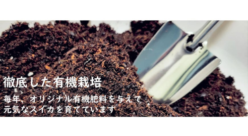 米ぬか、魚粉、油かすなどを混ぜて発酵させた肥料に牛糞や鶏糞を混ぜたオリジナル肥料を作って、元気なスイカを育てています。