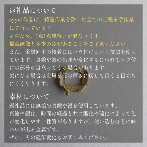 syyの作品は、鋳造作業を除いた全ての工程を手作業にて行っています。