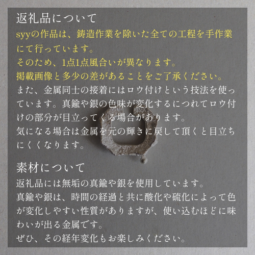 syyの作品は、鋳造作業を除いた全ての工程を手作業にて行っています。