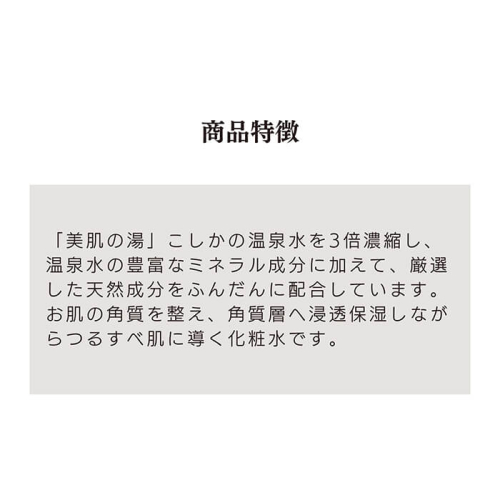 3倍濃縮した「美肌の湯」こしかの温泉水の豊富なミネラル成分に加えて、厳選した天然成分をふんだんに配合。 お肌の角質を整え、角質層へ浸透保湿しながらつるすべ肌に導く化粧水。