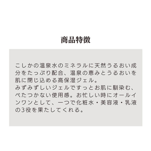 こしかの温泉水のミネラルに天然うるおい成分をたっぷり配合、温泉の恵みとうるおいを肌に閉じ込める高保湿ジェル。