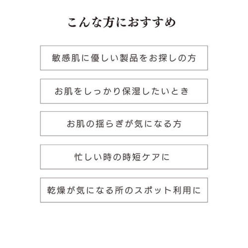 みずみずしいテクスチャーで、1つで化粧水・美容液・乳液の3役を果たしてくれます。乾燥が気になるところに重ね付けすることはもちろん、忙しい時にこれ一つで保湿ケアを完了できます。