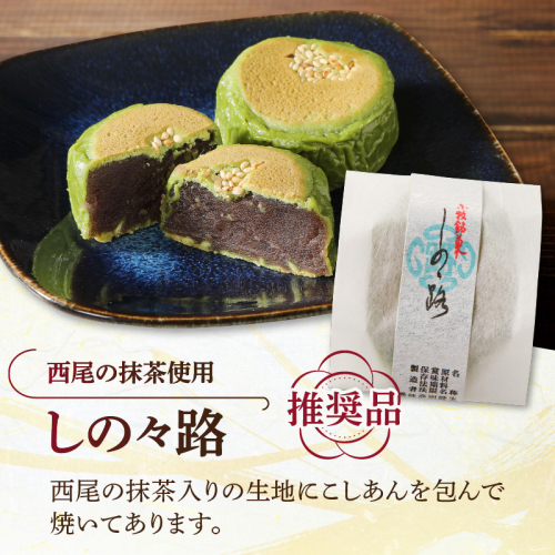 「しの々路」・・・西尾の抹茶入りの生地にこしあんを包んで焼いてあります。