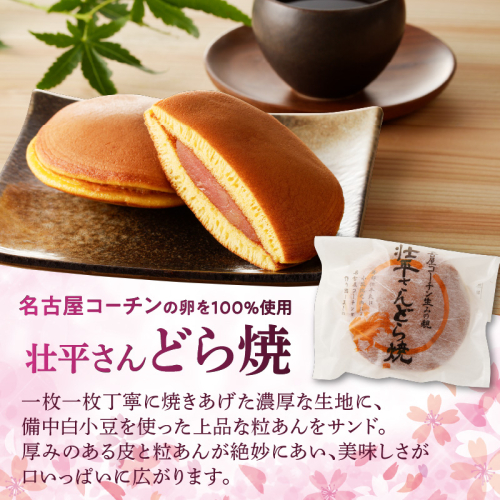 【説明】 ※春限定品(1月~4月お届け)※ 「壮平さんどら焼」・・・名古屋コーチンの卵を100%使用し、一枚一枚丁寧に焼きあげた濃厚な生地に、備中白小豆を使った上品な粒あんをサンド。 厚みのある皮と粒あんが絶妙にあい、美味しさが口いっぱいに広がります。 「桜どら焼」・・・桜葉をきざんだあんを皮にはさみ、春らしい味のどら焼に仕上げました。 「粒どら焼」・・・北海道産の小豆を使用して炊き上げた粒あんを皮にはさみました。 【原材料】 砂糖、小麦粉、ハチミツ、卵、水飴、りんご果汁、レモン果汁、桜葉、小豆、異性化液糖、卵(名古屋コーチン)、白小豆、大手亡、栗、洋酒、/着色料(赤102.105.106)、エタノール、香料、乳化剤、酸味料、クチナシ黄色素、増粘剤(キサンタンガム)、グリセリン、膨張剤 【保存方法】 常温 【配送方法】 常温 【地場産品基準】 3号:原材料の仕入れから、生地作り、焼き上げ、あんこ挟み、梱包までの全工程を行うことにより、相応の付加価値が生じているもの。