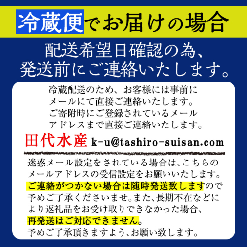 ※田代水産からお客様へ直接メールを送らせていただきます。迷惑メール設定をされている場合は、「k-u@tashiro-suisan.com」のメールアドレスの受信設定をお願いいたします。