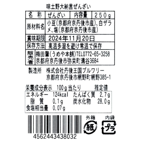 味土野大納言ぜんざいは、『京丹後市味土野の肥沃な土地で栽培した小豆は、通常より2倍程度大きく、味も香りも良く、煮崩れしにくい特性があります。