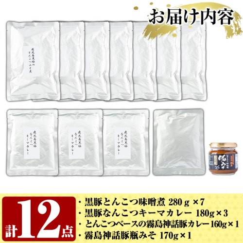 - C0-090 鹿児島県産黒豚特産品の詰合せ(4種計12個)【富士食品】霧島市 豚肉 惣菜 レトルト食品 レトルト おかず 小分け 郷土料理 豚骨味噌煮 トンコツ カレー レトルトカレー キーマカレー ポークカレー 常温 温めるだけ