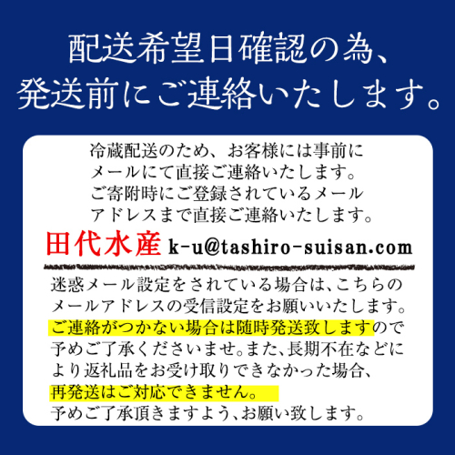 ※田代水産(mail:k-u@tashiro-suisan.com)からお客様へ直接メールを送らせていただきます。迷惑メール設定をされている場合は、「k-u@tashiro-suisan.com」のメールアドレスの受信設定をお願いいたします。