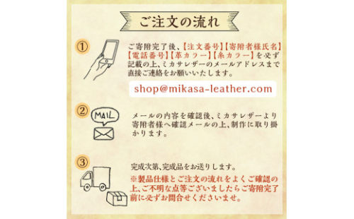 1.商品ページよりご寄附完了後、【注文番号】【寄附者様氏名】【電話番号】【革カラー】【糸カラー】を必ず記載の上、ミカサレザーのメールアドレスまで直接ご連絡をお願いいたします。