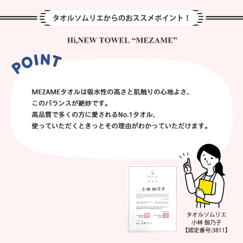「MEZAMEシリーズ」は、アメリカのカリフォルニア州サンホーキンバレーで栽培された繊維長の長いピマ綿を使用しており、長いパイルがふわふわの肌触りと高い吸水性を誇ります。