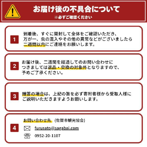 ※発送には万全を期しておりますが、万が一、外装破損、異物、汚れ等があった場合は、お早めに(一社)佐賀市観光協会(TEL:0952-20-1107 Mail:furusato@sagabai.com)までご連絡ください。