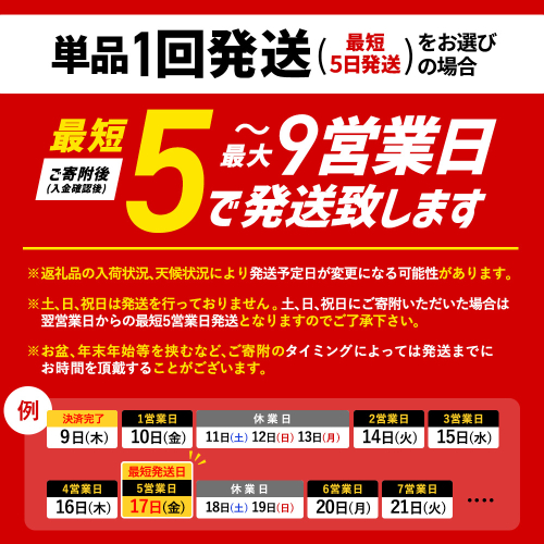 ※土、日、祝日は発送を行っておりません。土、日、祝日にご寄附頂いた場合は、翌営業日からの最短5営業日発送となりますのでご了承ください。