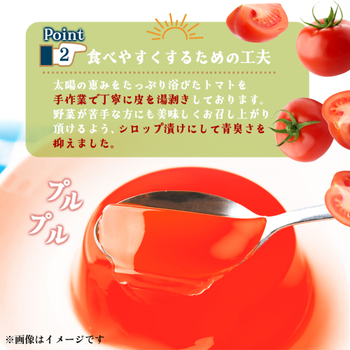岡山県産桃太郎トマトを使用したボリュームたっぷりのゼリー。 晴れの国おかやまで太陽の恵みをたっぷり浴びたトマトを手作業で丁寧に皮を湯剥きしました。 野菜が苦手な方にも美味しくお召し上がり頂けるようシロップ漬けにして青臭さを抑えました。 丸ごと一玉入れたトマトに合わせるゼリーにはトマトピューレとりんご果汁をバランスよく配合し、トマトの持つ風味を生かしながらもデザートとして楽しんでいただけるよう仕上げました! レモン果汁やグレープフルーツジュースなどをかけるとひと味違うサッパリとした美味しさとなり、食欲のない時や夏バテの時にもピッタリです。 【提供事業者】 岡山県農産食品加工株式会社
