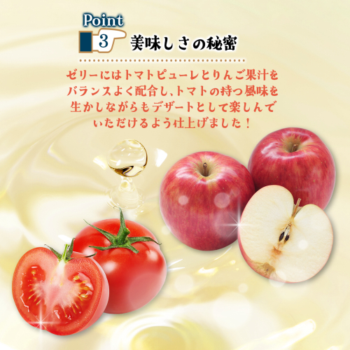 丸ごと一玉入れたトマトに合わせるゼリーにはトマトピューレとりんご果汁をバランスよく配合し、トマトの持つ風味を生かしながらもデザートとして楽しんでいただけるよう仕上げました!