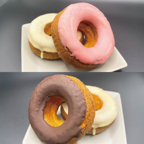 ドーナツの中には種類に合わせたクリームが入っており、カラフルなチョココーティングを施してあります。しっとりとした味わいの油で揚げないヘルシーな焼きドーナツです。