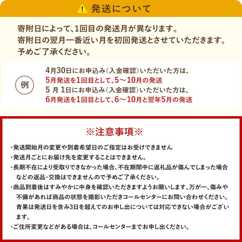 例1)4月30日にお申込み(入金確認)いただいた方は、5月発送を1回目として、5~10月の発送