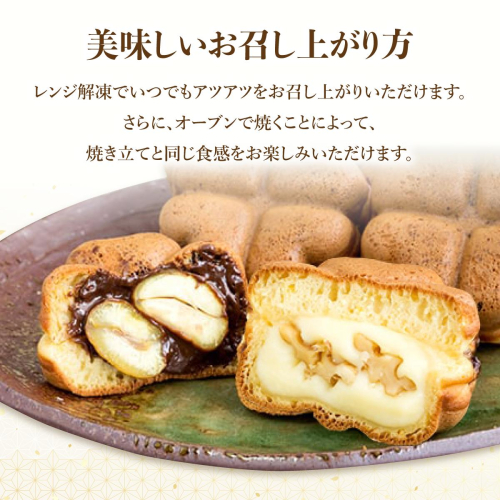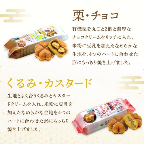 ハートの形を四つ合わせて、しあわせのメッセージを込めました。くるみと栗の周りをふんだんなク リームで包み、生地もよりマイルドな味わいとなっております。くるみ・カスタード 5個入パッケージと 栗・チョコ 5個入りパッケージの詰め合わせセットです。大切な方への贈り物 にもご利用くださいませ。 ※冷凍でお届けいたします。冷凍で6か月保存できます。 ※レンジ解凍でいつでもアツアツをお召し上がりください。さらにオーブンを通すことによって焼き 立てと同じ食感をお楽しみいただけます。また、自然解凍でももっちり美味しく、旅のお供としても お楽しみください(詳しくは、パッケージの裏面に記載)