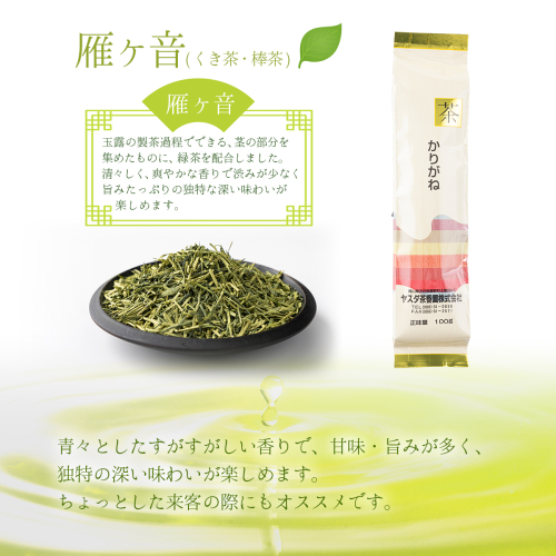 ヤスダ茶香園が長年こだわって作り続けてきた健康茶に、さわやかな香りとあっさりとした渋みの「煎茶」、甘み・旨味の多い「かりがね」、ふくよかな甘みと濃厚なコクの「抹茶入り玉露」を加えた飲み比べのセットです。