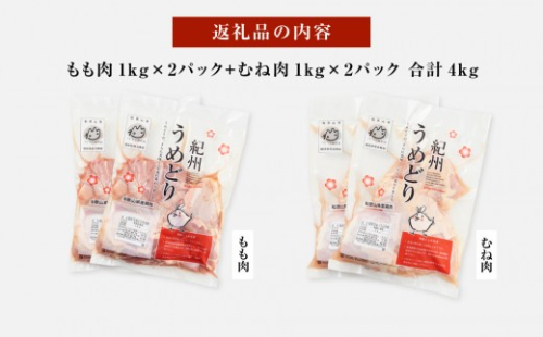紀州うめどり もも肉 1kg × 2パック & むね肉 1kg × 2パック 合計 4000g セット 冷凍 鶏肉 鶏 地鶏 肉
