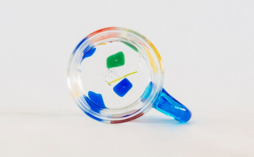 透明なガラスに、赤・青・緑・黄色・白などの色がちりばめられた、楽しい気分になるマググラスです。