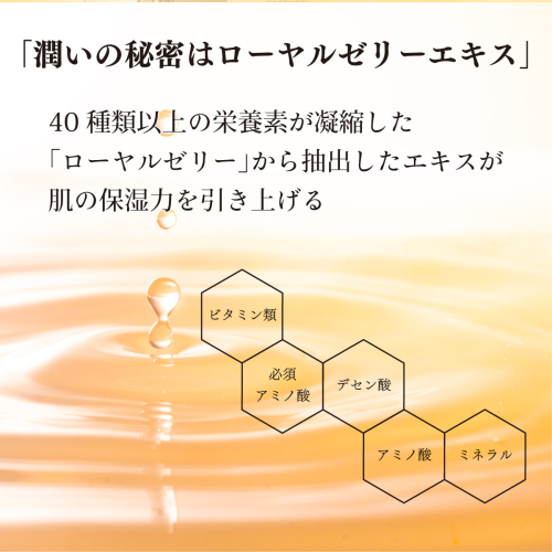 「デセン酸含有ローヤルゼリーエキス」を60%配合したさらっとした軽いつけ心地の美容液です。