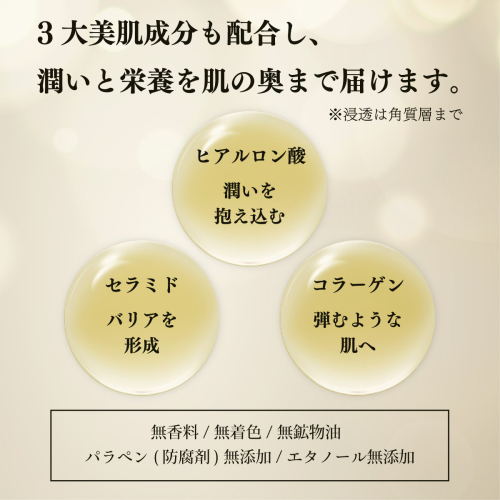 年齢を重ねたお肌にも優しい処方とたっぷり配合した美容液成分で加齢や刺激に負けない強く健やかなお肌へと整えます。