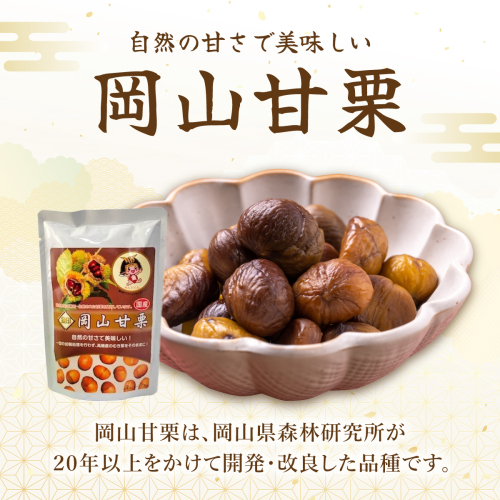 岡山甘栗(岡山1号、岡山3号)は岡山県森林研究所が、10年の歳月をかけて品種改良を重ねながら作り上げ、栗自体の糖度が30度以上にもなり非常に甘みのある栗です。