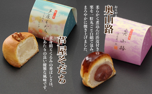 ●奥山路:柔らかく煮込んだ渋皮付きの栗を一粒丸ごと白餡で包み、まろやかに焼き上げました。