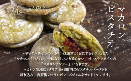 マカロンピスタチオは、マカロン生地にイタリアBABBI社のピスタチオペーストを練り込み、自家製フランボワーズジャムをサンドしました。ピスタチオとフランボワーズの王道の組み合わせに加え刻んだピスタチオをトッピングに使っているので、味でも食感でもピスタチオを楽しんでいただけます。