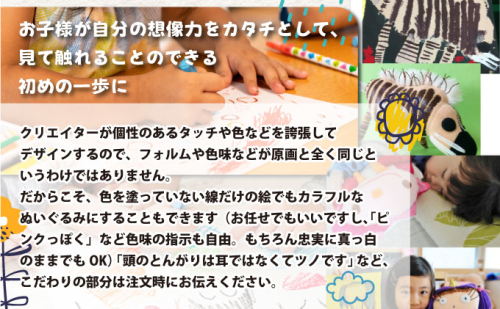 ※絵をアレンジしてぬいぐるみに合うデザインにしますので、原画の形や色が全く同じに再現されるものではありません。