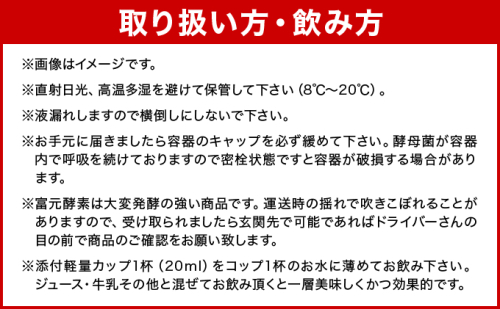※富元酵素は大変発酵の強い商品です。運送時の揺れで吹きこぼれることがありますので、受け取られましたら玄関先で可能であればドライバーさんの目の前で商品のご確認をお願い致します。