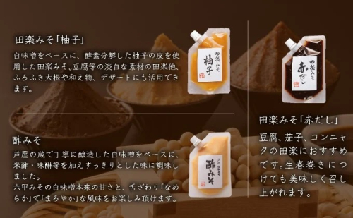 - 10個(9種)詰め合わせ:芦屋蔵造(豊熟味噌×2個、田舎味噌×1個、白味噌×1個、赤だし味噌×1個、あわせ味噌×1個、黒大豆味噌×1個)各300g、田楽味噌(柚子、赤だし)各120g×1個、酢味噌 140g×1