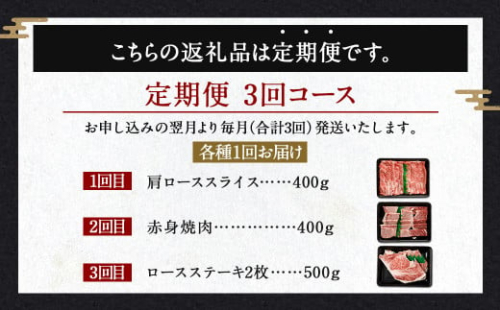 - 【3ヶ月定期便】<宮崎牛 ローススライス・赤身焼肉・ロースステーキ>お申込みの翌月下旬頃に第一回目発送(12月は中旬頃) 宮崎牛 牛肉 黒毛和牛 ロース スライス 赤身 焼肉 ステーキ 極上 肉質 宮崎県産 定期便