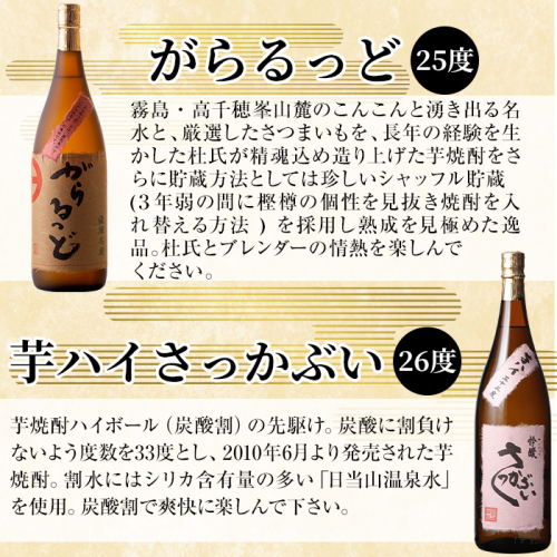 「芋ハイ さっかぶい」 芋焼酎ハイボール(炭酸割)の先駆け。炭酸に割負けないよう度数を33度とし、2010年6月より発売された芋焼酎。割水にはシリカ含有量の多い「日当山温泉水」を使用。炭酸割で爽快に楽しんで下さい。 「がらるっど」 霧島・高千穂峯山麓のこんこんと湧き出る名水と、厳選したさつまいもを、長年の経験を生かした 杜氏が精魂込め造り上げた芋焼酎をさらに貯蔵方法としては珍しいシャッフル貯蔵(3年弱の間に 樫樽の個性を見抜き焼酎を入れ替える方法)を採用し熟成を見極めた逸品。杜氏とブレンダーの情熱を楽しんで下さい。 地産理由:市内の蒸留所で製造した焼酎 原材料: ・芋ハイ さっかぶい:さつまいも、米こうじ ・がらるっど:さつまいも(南九州産)、米麹(国産米)