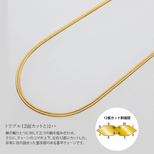 トリプル12面喜平とは、1コマに12面のカットが施され、様々な角度から煌めく喜平チェーンです。