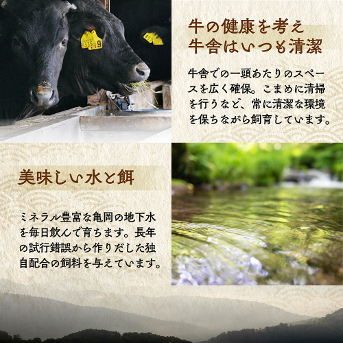 亀岡市は美しい水と空気にめぐまれたのどかな田舎町です。夏と冬の気温差は35℃以上と牛には厳しい環境ですが、その環境が身を引き締め、とても美味しく格別な味にしております。生産農家は飼育にこだわりを持っております。他のブランド肉と違うのは、亀岡では2ヶ月~半年ほど長く飼育して牛が成熟するのを待ちます。そうする事によりお肉の風味や油の艶を引き出し、からっとしたしつこくない味に仕上げております。