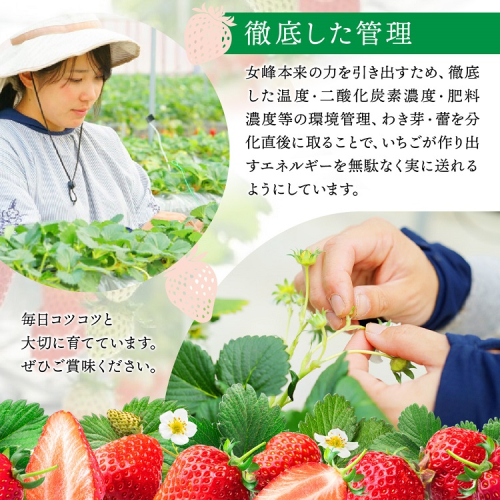当園では「女峰」本来の力を引き出すため、徹底した温度、二酸化炭素濃度、肥料濃度等の環境管理と、わき芽、蕾を分化直後に取ることで、いちごが作り出すエネルギーを無駄なく実に送れるようにしています。日々、大変な作業ですが毎日コツコツと大切に育てています。
