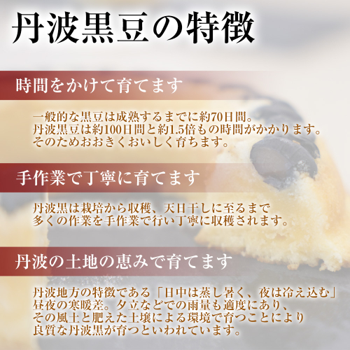 バターと卵をたっぷり使ったふっくらプレミアムな焼き菓子で御座います。しっとりと焼き上げたパウンドケーキの中にふっくら炊き上げた丹波黒豆をアクセントにした、丹波黒豆が主役のパウンドケーキです。明智光秀が天正7年(1579年)丹波国を平定した時の事を思い描き、お菓子のフォルムを円形(ドーナツ型)に致しました。「丹波国を丸く治める!」バターの風味がふくよかで口どけの良いケーキと丹波黒豆が冴えわたる絶品丹波銘菓で御座います。