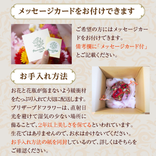 プリザーブド加工がされているので、水やりの手間がなく人気のお品です。
