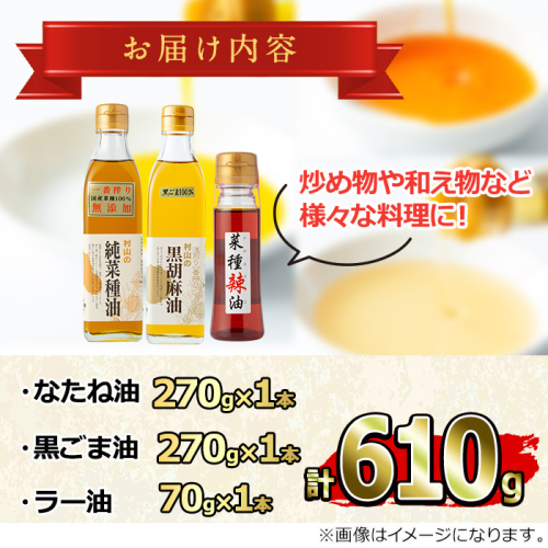 【0141313a】絶品!こだわり油のおためし3点セット(合計610g・270g×2本・70g×1本) 油 調味料 オイル ナタネ油 なたね油 ごま ゴマ ごま油 黒胡麻 ゴマ油 ラー油 らーゆ 揚げ物 炒め物 天ぷら 餃子【村山製油】