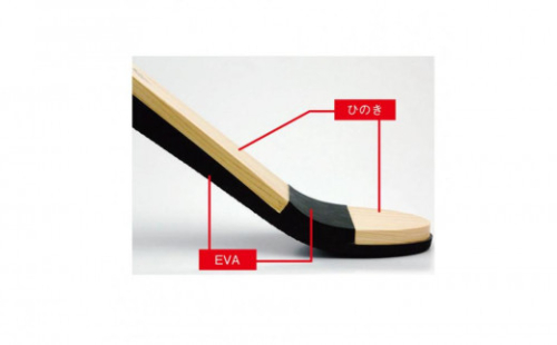 ※2枚のヒノキを伸縮素材でつなぐことで、ソールが足裏の動きに合わせて屈曲します。
