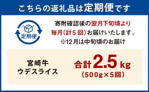 - 【5ヶ月定期便】<宮崎牛ウデスライス 500g(1パック:500g×5回)> お申込みの翌月下旬頃に第一回目発送(12月は中旬頃) 牛肉 お肉 肉 和牛 新生活応援 卒業祝い 就職祝い 入学 卒業 お花見 引越し