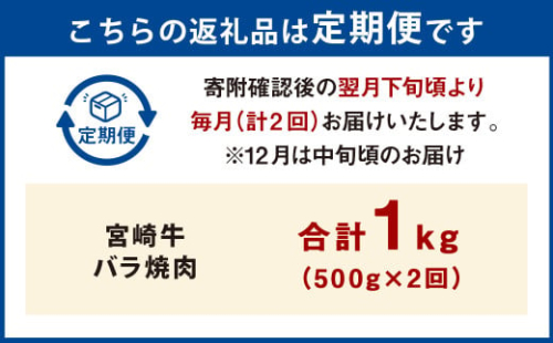 - 【2ヶ月定期便】<宮崎牛バラ焼肉 500g(1パック:500g×2回)> お申込みの翌月下旬頃に第一回目発送(12月は中旬頃) 牛肉 お肉 肉 和牛 新生活応援 卒業祝い 就職祝い 入学 卒業 お花見 引越し